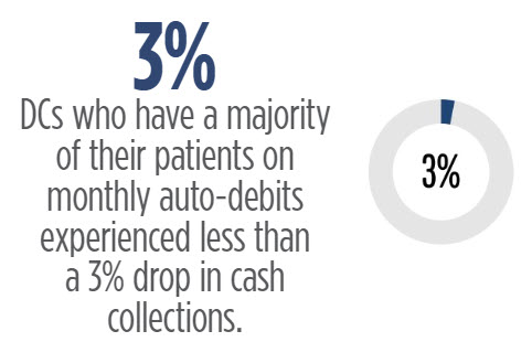 Our data showed us a significant difference between those doctors who had strategies in place designed to increase patient retention and those who did not. The doctors who were having patients pay-per-visit saw a 50% drop in cash collections. Compare that to the doctors who have a majority of their patients on monthly auto-debits, a key strategy for increasing patient retention, who experienced less than a 3% drop in cash collections. That’s a HUGE difference.