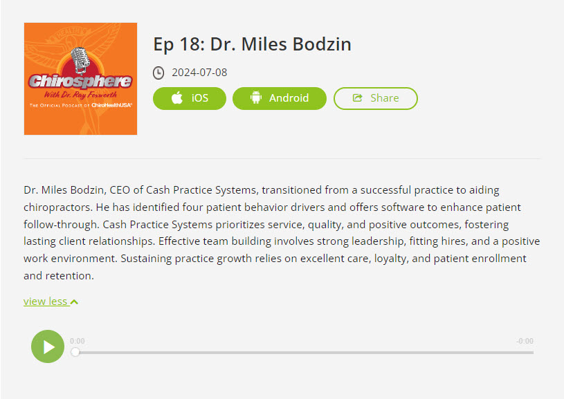 Dr. Miles Bodzin, esteemed in chiropractic care, leads Cash Practice Systems as its Founder and CEO, dedicated to enhancing revenue and retention rates in the chiropractic community. His platform offers tools like The Wellness Score, Care Plan Calculator, Auto-Debit, and Drip-Education Systems, empowering practitioners for better patient retention and profitability. With extensive experience, Dr. Bodzin's leadership has made Cash Practice Systems the top choice for optimizing chiropractic practices. Before his CEO role, he ran a thriving practice in San Diego for nearly two decades, alongside his Chief Operations Officer, Holly Jensen, emphasizing high retention rates and patient well-being. Together, they've dedicated over two decades to advancing chiropractic care, inspiring practitioners worldwide. Explore CashPractice.com for transformative tools.